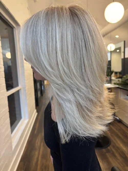 Blonde Bombshell. Root retouch to refresh grey and blonde highlights with a fresh haircut to add movement and volume.